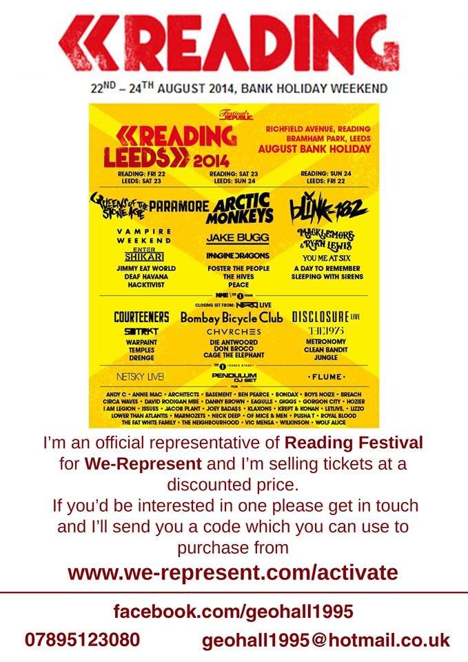 Anyone up for going to 2014’s Reading Festival? Contact our Editor George Hall on the information below to get tickets at a discounted rate to buying them staright from the festival website. George is an official Reading Festival rep, working with We-Represent.