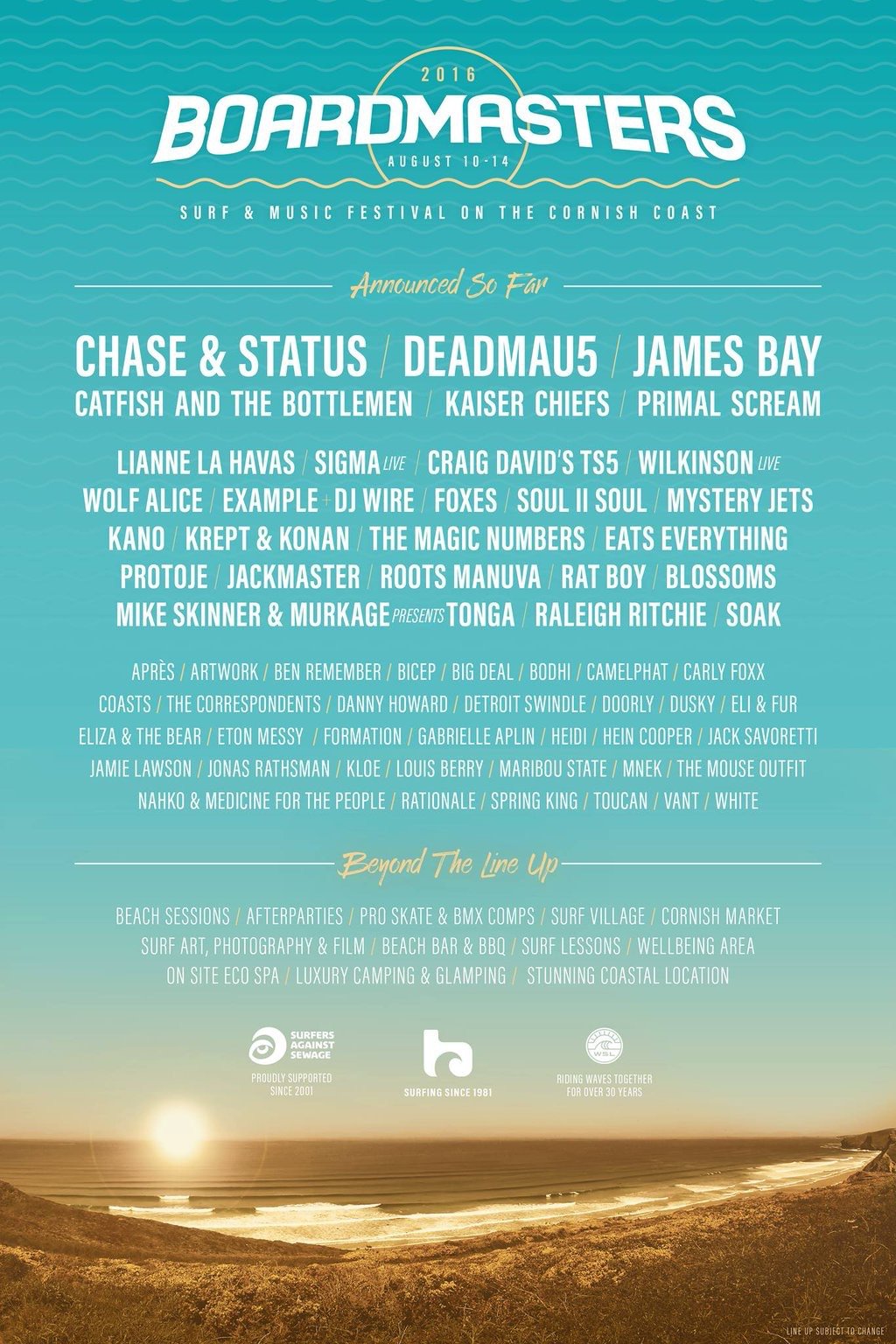 Boardmasters is held at Watergate Bay and Fistral Beach from Wednesday 10th to Sunday 14th August 2016, and was headlined by Faithless, Rudimental and Bastille in 2015.