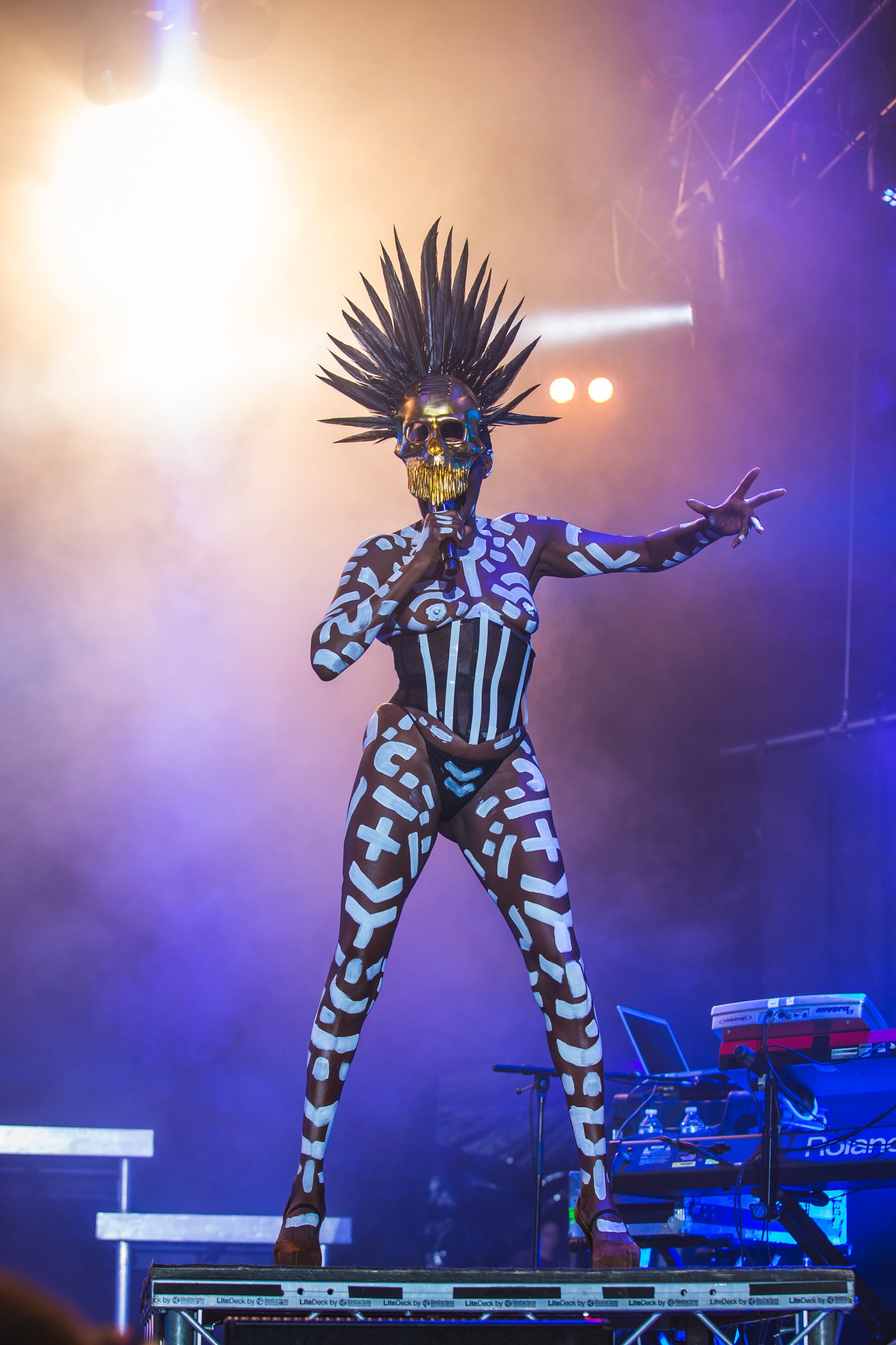 The final hour, though, was reserved for the great that is Grace Jones. Jones’ master set was a remedy of improvised mania and choreographed showmanship. Grace Jones has a heart of controlled funk and disco, and her voice is second to none, even at 67. There are costume changes galore, precarious headdresses, African masking, a voodoo male pole-dancer and strongman, a trip into the crowd on a security man’s shoulders, theatrical demands for more wine, impressive hula-hooping stamina, a climactic tickertape spectacular, fireworks, and a killer final duo of “Pull Up to the Bumper” and “Slave to the Rhythm”.