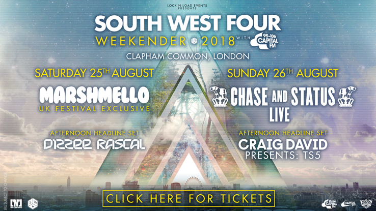 London’s biggest dance music festival, South West Four will return this August as the festival celebrates its fifteenth anniversary. Organisers announced this week that identity-less DJ/producer Marshmello will headline the Saturday night, whilst British drum and bass heavyweights Chase and Status, who are also celebrating their fifteenth anniversary will headline the Sunday. London rapper Dizzee Rascal will perform an afternoon headline set on the Saturday, with Southampton garage legend Craig David performing a headline set on the Sunday afternoon. Other acts announced include Andy C, Bugzy Malone, Disciples, James Hype, Jonas Blue, Nadia Rose, Netsky b2b Jauz b2b Slushii, My Nu Leng, Sigma and Stefflon Don. South West Four will take place at Clapham Common on the bank holiday weekend of 25th-26th August.