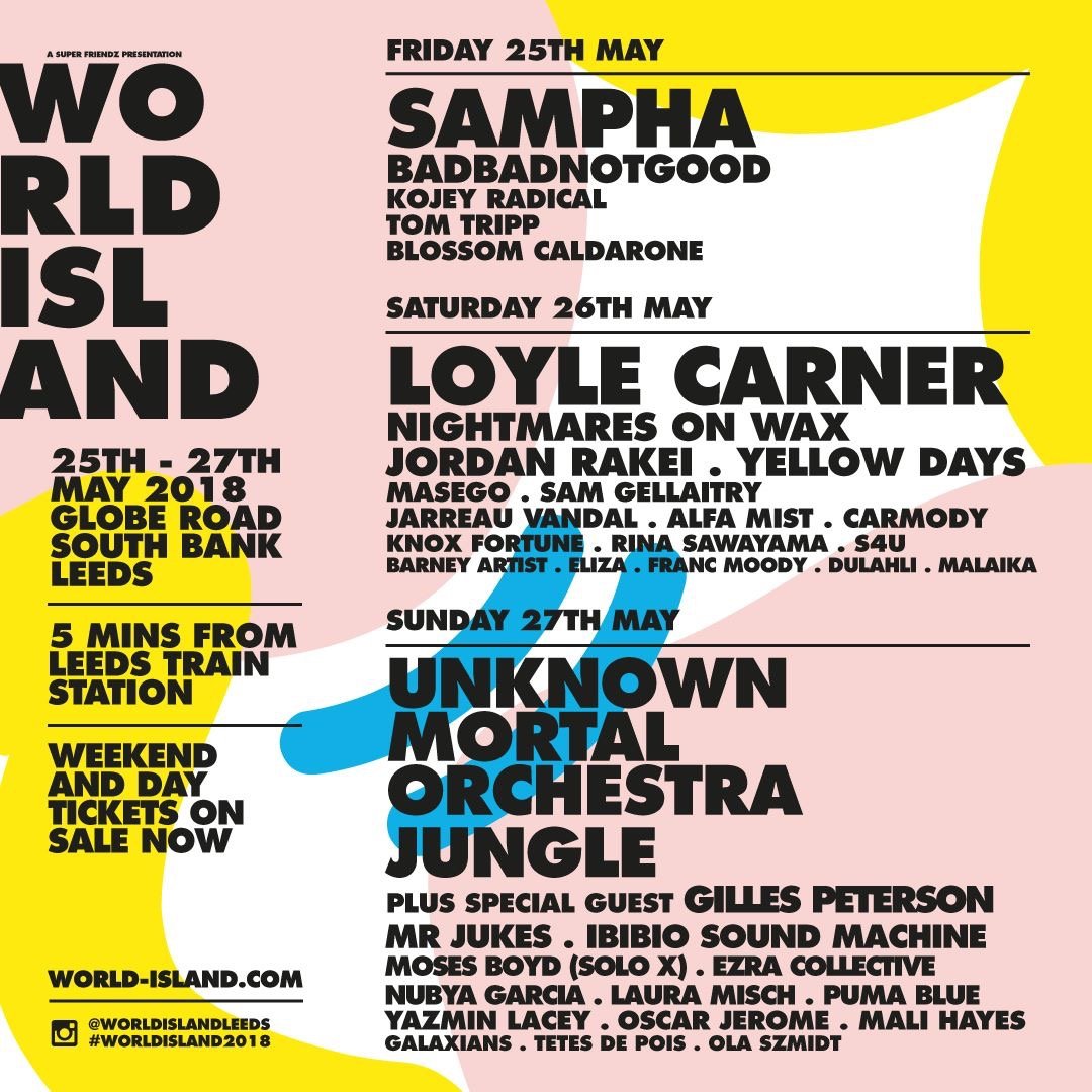 Leeds’ urban festival World Island returns to the city on late May bank holiday weekend with an impressive lineup of artists in a multitude of different genres. British singer/songwriter Sampha heads up Friday night with Canadian electronic group Badbadnotgood offering support. UK hip-hop prodigy Loyle Carner takes top spot on Saturday with producer Nightmares on Wax, Jordan Rakei and Yellow Days also on the bill. Sunday will see New Zealand alt-rock four-piece Unknown Mortal Orchestra headline with indie band Jungle and BBC Radio DJ Gilles Peterson also playing. Former Bombay Bicycle Bay frontman Jack Steadman with his new project Mr Jukes also features on the Sunday.
