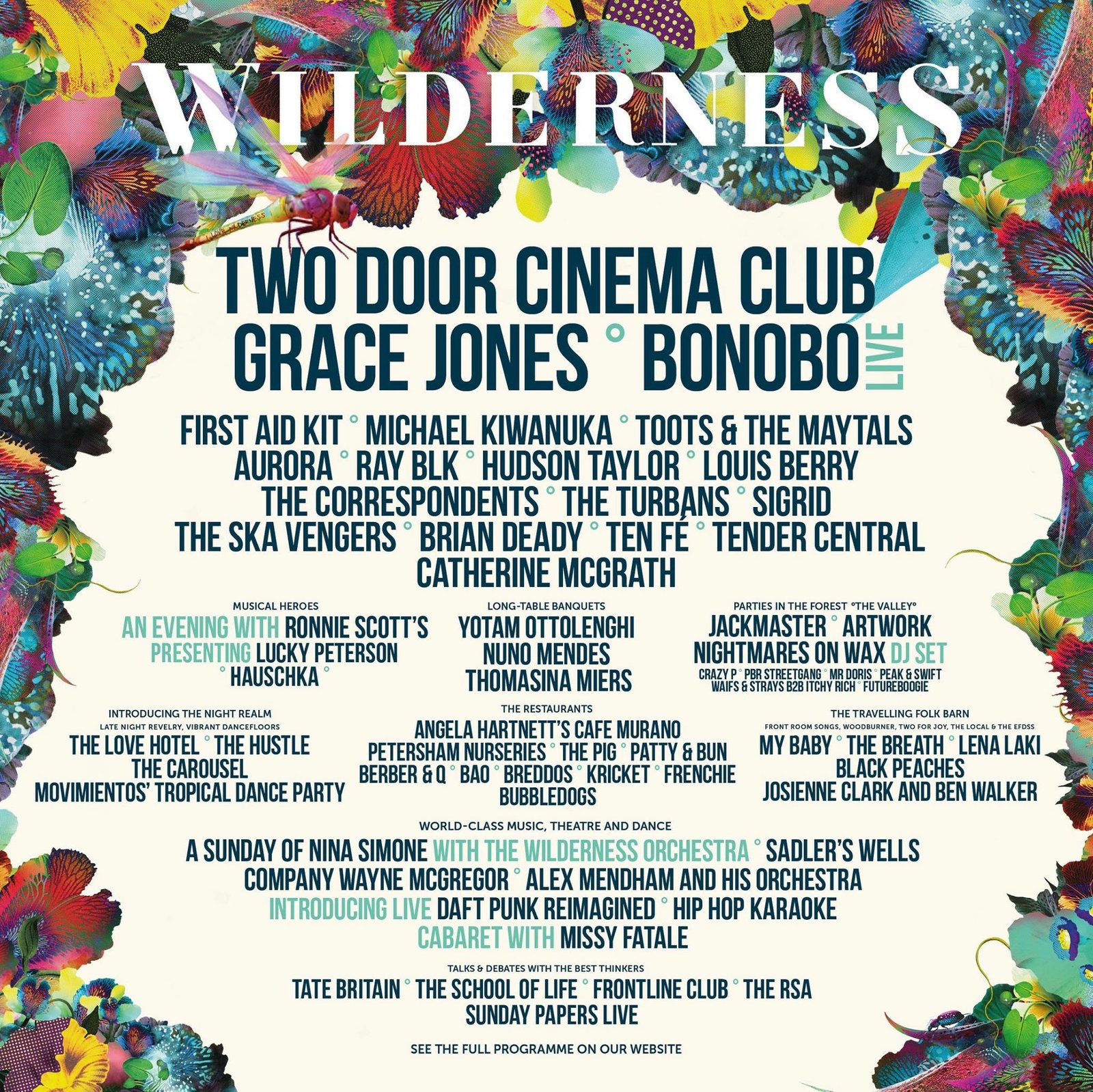 This year Wilderness brings some special headliners in the form of Irish indie pop sensations Two Door Cinema Club, powerful singer/songwriter Grace Jones and the mind-bending vibes of Bonobo (Live). An impressive roster of DJs will play parties in the forest with Scottish prodigy Jackmaster, tech/house producer Artwork and Nightmares on Wax (DJ Set) all spinning records through the night. There’s a lot more to Wilderness that meets the eye with long table banquets, restaurants and debates all happening around the festival.