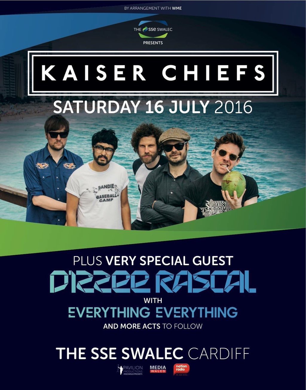 Joining Kaiser Chiefs in Cardiff will be London Rapper Dizzee Rascal and Manchester indie band Everything Everything, with more support artists to be announced soon.
